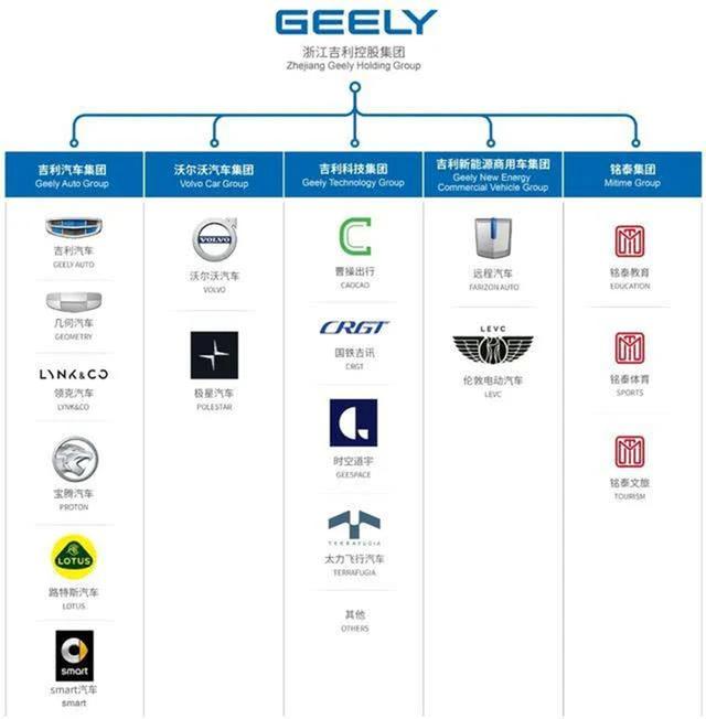 吉利控股集团下设5个集团公司,分别是吉利汽车集团、沃尔沃汽车集团、吉利科技集团、吉利新能源商用车集团、铭泰集团。