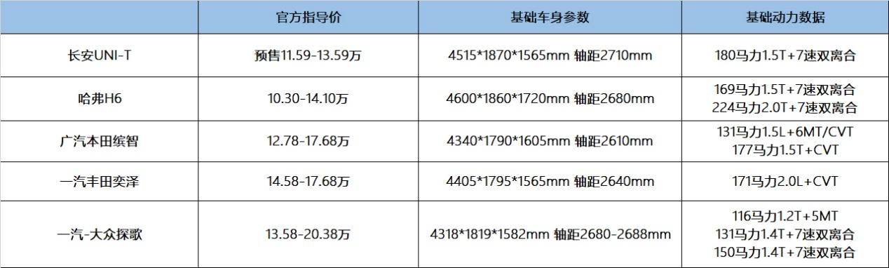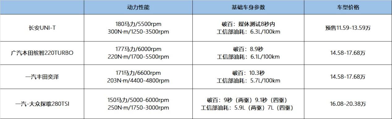 作为对比来看,大众探歌更多在吃老底,丰田还是那个丰田,行业中上游的表现。而长安UNI-T做到了性能上和本田1.5T的对标,还有加速能力上的优势。更重要的是,对比起同等动力水准的车型,它的价格是绝对的优势,即便是顶配版本的表现也明显低于其他车型的入门表现。