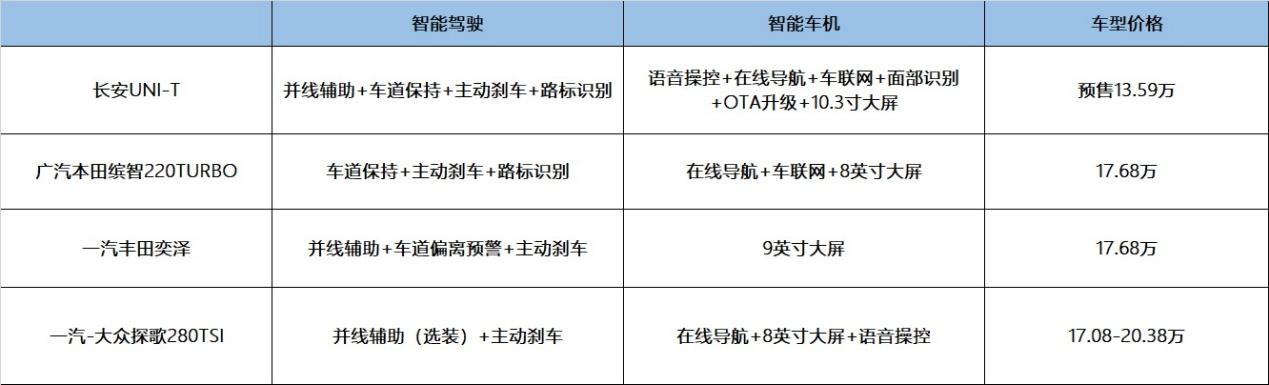 另一个新兴主流消费需求层面,长安UNI-T的优势被进一步放大。大众探歌在这一层面的表现并不够好,价格过高的同时实现功能少;本田缤智有着相应的优势,能和长安UNI-T一定程度上相抗衡,但结合价格来看,已经接近18万元。