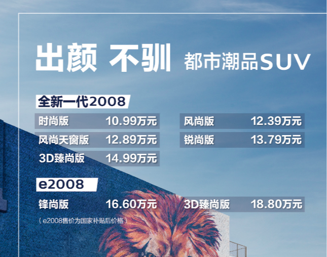 和以往虚高的定价策略不同,此次全新2008的入门门槛非常亲民。10.99万的价格比缤智更具诱惑力,极大地提升了全新2008在小型SUV市场中的竞争力。