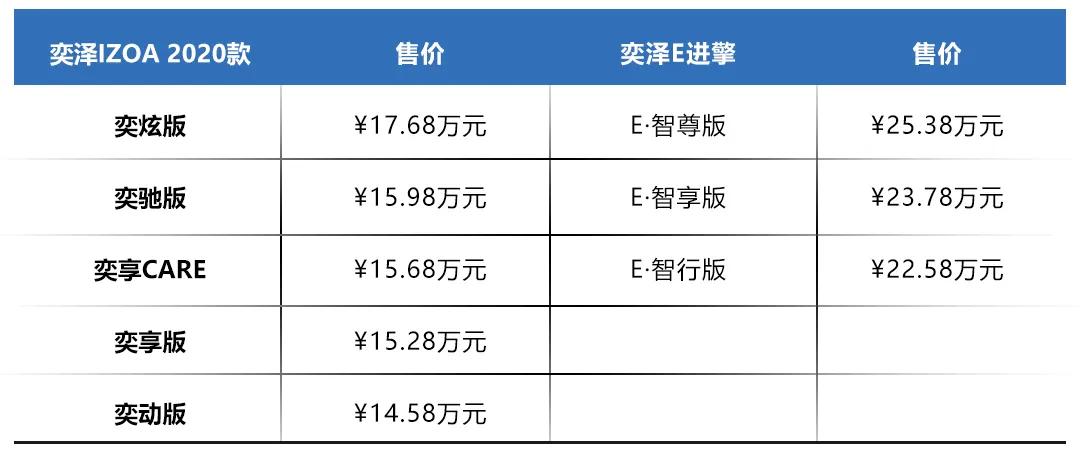 至于2020款奕泽燃油版,主要是在配置上进行升级,新增了奕享版和奕享CARE特别版。其中奕享CARE特别版新增了自动防炫目内后视镜、驻车雷达、专属蓝黑织物合皮座椅,并在副驾驶位置提供了纸巾袋。