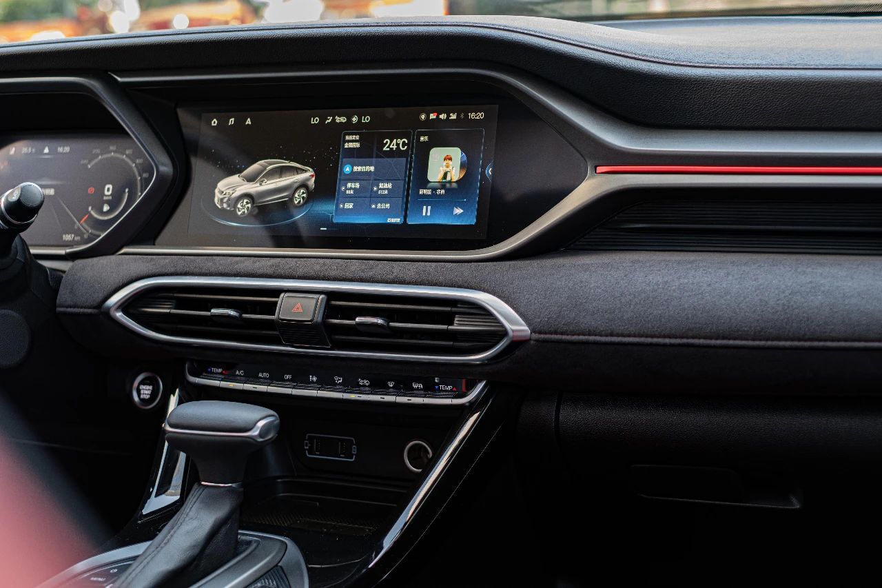 坐进车里,广汽传祺GS4的内饰设计依旧是以运动、年轻为主基调出发,黑色为主红色为辅的颜色搭配一直就是运动的代表色,而中控台大面积的软质材料和皮质包裹也增加了手感,而我最喜欢的,也是最提升档次的就是红色缝线加上翻毛皮面料的中控底部饰板,触感和视觉效果绝对不一般,我喜欢的不得了。