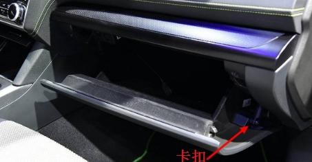打开手套箱到最大位置,能够看到固定卡扣,将其取下,用双手将手套箱两边向中间挤压,手套箱就可以拆卸下来;