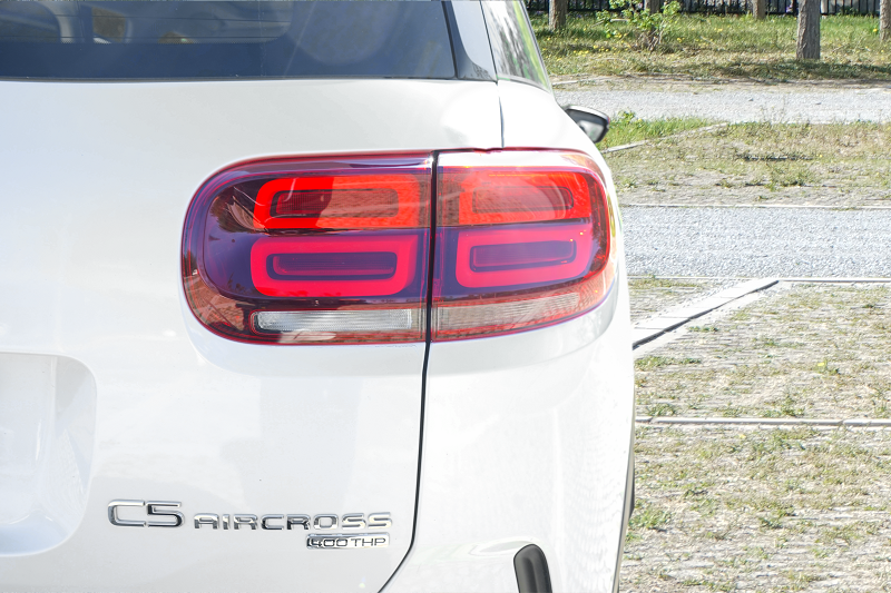 天逸C5 AirCROSS的尾部设计也一如前脸,圆润饱满,看上去颇为厚实,其中我最喜欢的是它的尾灯设计,呈矩阵式排列的四个“小红圈”十分精致,给人一种赏心悦目的感觉,而车尾的400THP表示则是它的身份象征。