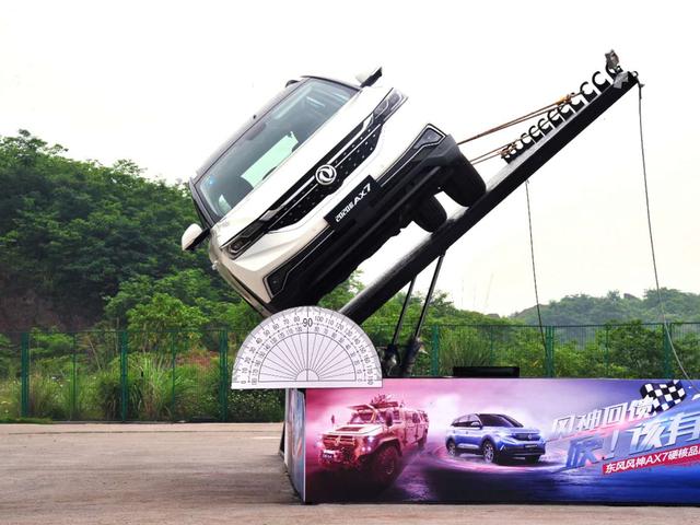 东风风神AX7的极限侧倾是现场所有人的关注重点,令人吃惊的是,直至它成了一个倾斜达50°、常人都无法站立的陡坡时,东风风神AX7依然安如磐石!