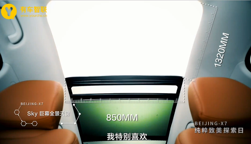 同时,BEIJING-X7还配备了“Sky 巨幕全景天窗”,天窗尺寸为1320*850mm,保持了良好的采光和通风性,从中爬出时,也不用担心被卡,为我们带来更加愉悦的驾乘体验。