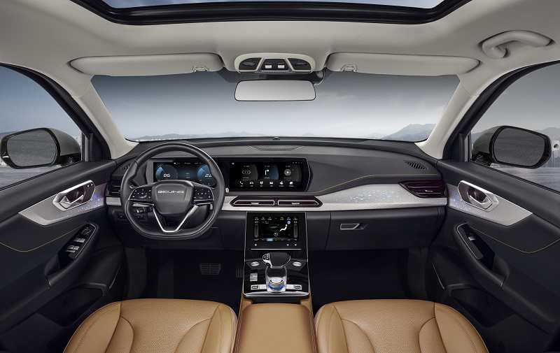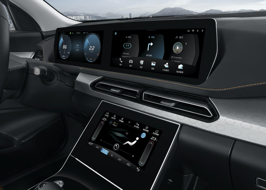 内饰部分,新车同样运用了少量六边形元素,使得车内看上去十分整洁。具体来看,新车配备了一块贯穿式的液晶仪表和一块大尺寸液晶中控屏,其多功能方向盘还采用的触摸设计,另外,新车还在中控等区域配备了波谱律动氛围灯,整个车内极具科技感。