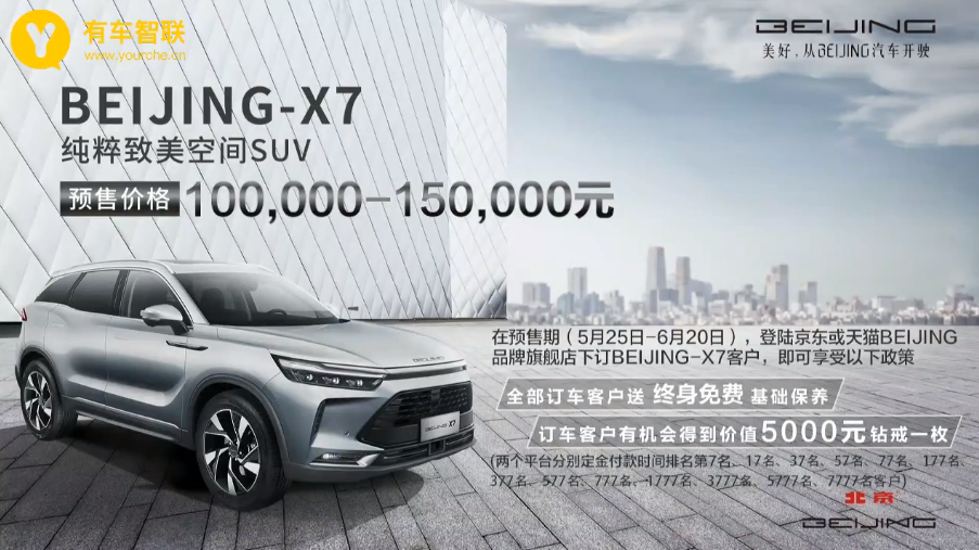 5月25日,在北京汽车BEIJING-X7 (配置|询价)纯粹致美探索日上,北京汽车蓝谷营销服务有限公司总经理李一秀宣布旗下全新中型SUV——BEIJING-X7即日起全面开始接受预订,新车的预售价区间为10万-15万元,在6月20日前,订车客户可享受终生免费基础保养,更有机会赢得价值5000元的钻戒一枚。