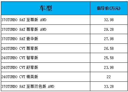 动力:240 TURBO车型配备了1.5T涡轮增压发动机,最大功率为142k W,峰值扭矩为243N·m,传动系统与CVT变速箱匹配;370 TURBO车型配备2.0T涡轮增压发动机,最大功率为200kW,峰值扭矩为370N·m,传动系统匹配9速手自一体变速箱。