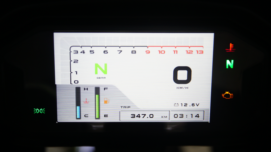 在仪表设计上要多说一点,对于不了解台荣的朋友,可能不知道它是国内和国外很多摩企的仪表供应商,所以对于这款台荣的倾情之作,自然要把最好的产品安装在它的身上。高配车型配备的TFT仪表,拥有全面的骑行数据且清晰易读。