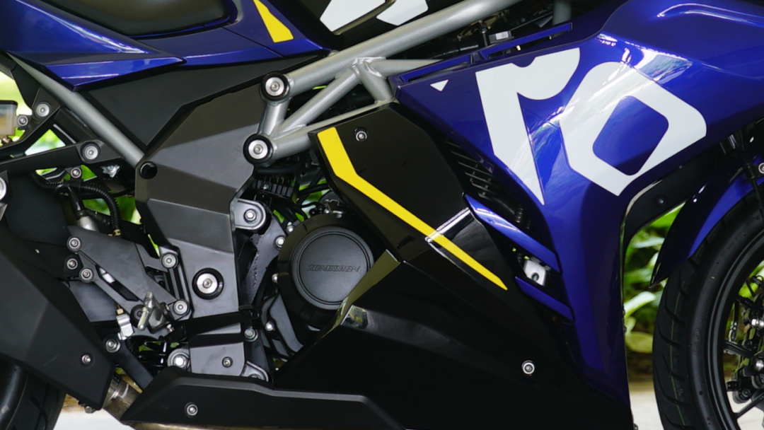 GP1 250R搭载了宗申制造的并列双缸风油冷发动机,249.5cc的排量能发挥出12.5kW/8500rpm的最大功率和16.5N.m/6000rpm最大扭矩。从数据上看并不出众,但满足日常应用足够了。而且同步双缸的配置,让它拥有了绵密悦耳的声浪。