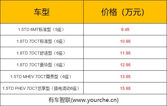 动力方面,1.5升三缸涡轮增压发动机,最大功率177马力,最大扭矩255牛·米,1.8升四缸涡轮增压发动机,最大功率183马力最大扭矩300牛·米,选装48V BSG的1.5升三缸涡轮增压发动机,综合最大功率190马力,综合最大扭矩为300牛·米。最后,1.5TD PHEV插电混动版本,综合最大功率258马力,综合最大扭矩为415牛·米,纯电模式下最大续航里程为56公里,传动方面,除入门版搭配6速手动变速器外,全系标配7速湿式双离合变速器。