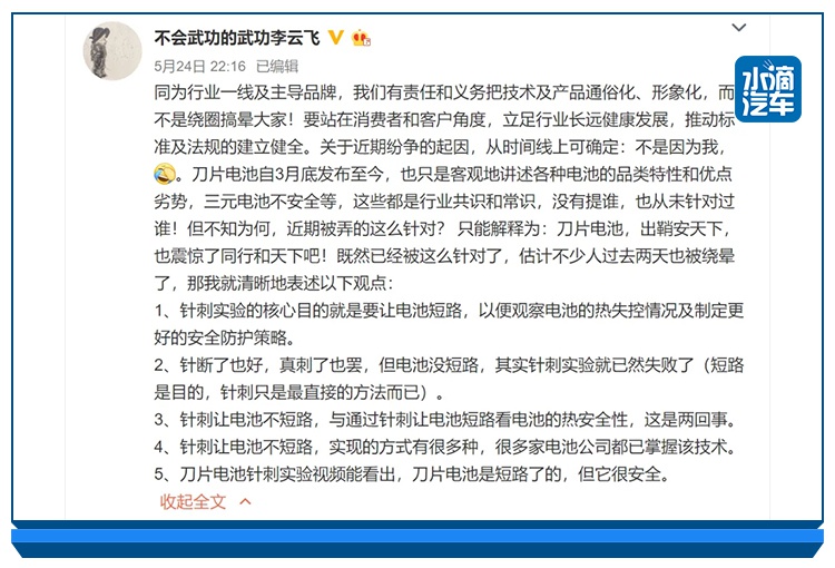 5月24日,比亚迪汽车销售公司副总经理李云飞再次发表微博表示,针刺实验的核心目的是为了让电池短路,从而观察电池热失控情况以便制定更完善的安全防护措施,不是为了让电池不短路。而刀片电池针刺实验能看出它是短路了的,但是它很安全。