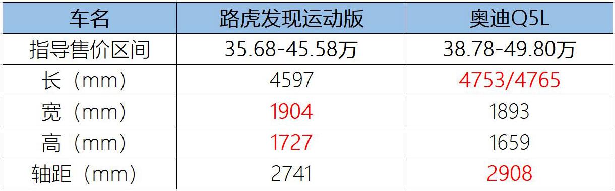 同为中型SUV,在车身尺寸方面,两车取舍各不相同。可以看到,路虎发现运动版更宽更高,从车头和车尾正向看去会更显得更大。而奥迪Q5L的车身优势就在加长,所以车身长度和轴距优势非常明显。单从外部尺寸上奥迪Q5L的优势还是比较明显,显然这一点奥迪还是更懂国内消费者。