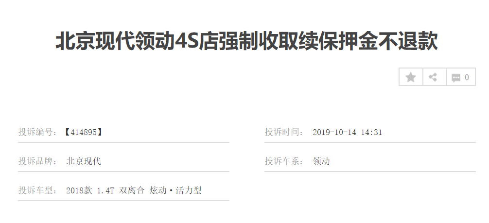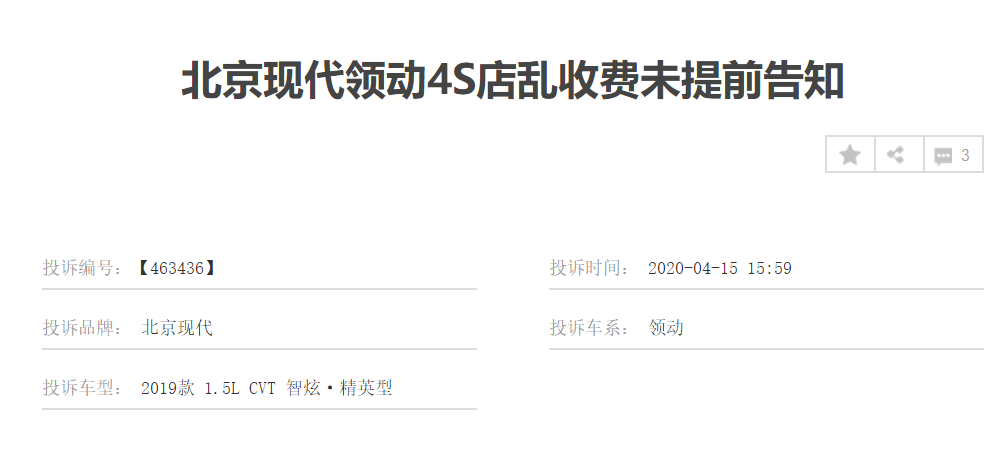 根据一位车主的投诉,自己购买的2019款北京现代领动由于出现故障拖车到4S店维修,报价4万多,选择不维修后,仍被要求支付预估价40%的费用及拖车费,这些费用都没有提前告知,欺骗消费者乱收费。