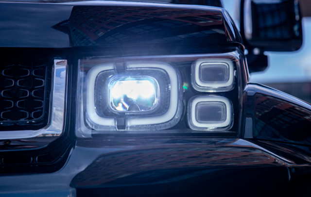 外观方面,新车整体造型与在售车型基本保持一致,外观依旧采用家族方正硬朗的设计风格,经典五孔进气格栅在镀铬饰件的点缀下,彰显着豪放与粗犷;垂直风挡和外挂式备胎,则形成独具一格的都市硬派潮流风范。此外,银色前护板搭配红色的拖车钩,非常有“野性”,同时也使整个车头更具视觉冲击力。此外,新车标配了拖车钩、电动外后视镜、后雨刷等,而高配车型还配备了侧踏板、后视镜电动折叠以及自动雨刷等。