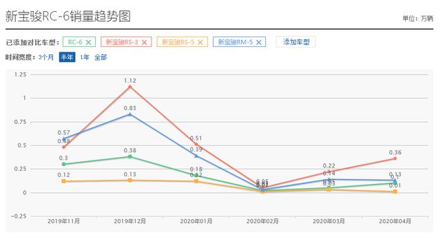 另外新宝骏的首款掀背轿车RC-6也是一个大胆的尝试,不过被不少网友诟病它的价格与做工不符啊等等,不过销量确实是最好的印证。从问世到如今新宝骏RC-6的销量最高峰也不过是2019年9月份的5300台,而2020年4月份也仅有1000台。