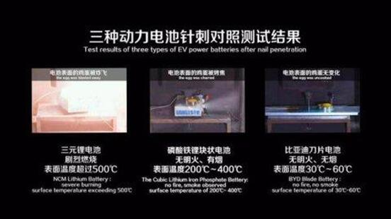 最后不同的电池材料在扎的过程中的反应是不同的。磷酸铁锂材料的放热启动温度高,放热慢、产热少,高温下也不会释放出强氧化性物质助燃;刀片电池也是一种磷酸铁钾电池,设计的长条形电芯散热面积大,产热能力也比较低,加强了其安全性;而三元锂材料电池确实很难通过针刺测试。