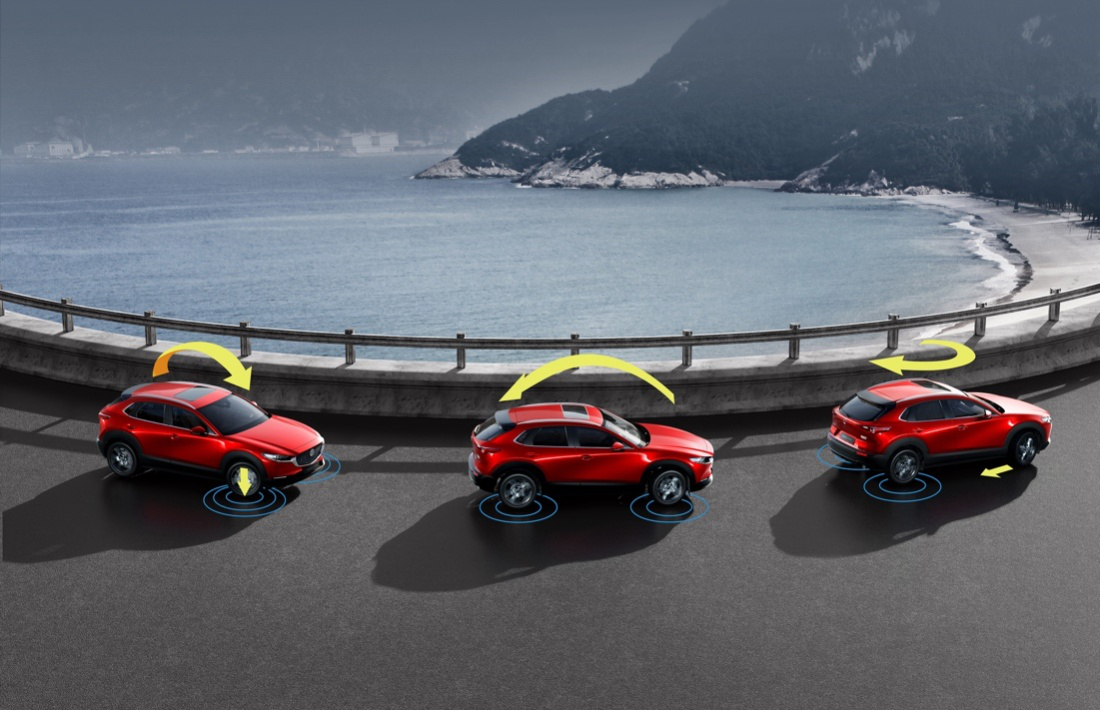 MAZDA CX-30同样搭载了创驰蓝天车辆动态控制技术的最新成果——GVC加速度矢量控制系统的升级版——GVC PLUS。当车辆进入弯道时,GVC PLUS系统通过控制发动机扭矩输出,提高车身的响应性能,新增的回正力矩强化控制系统,抑制过度转向的同时,提高转向中和出弯道的车身稳定性,让驾驶者在弯道驾驶中信心更强、安心感更足。