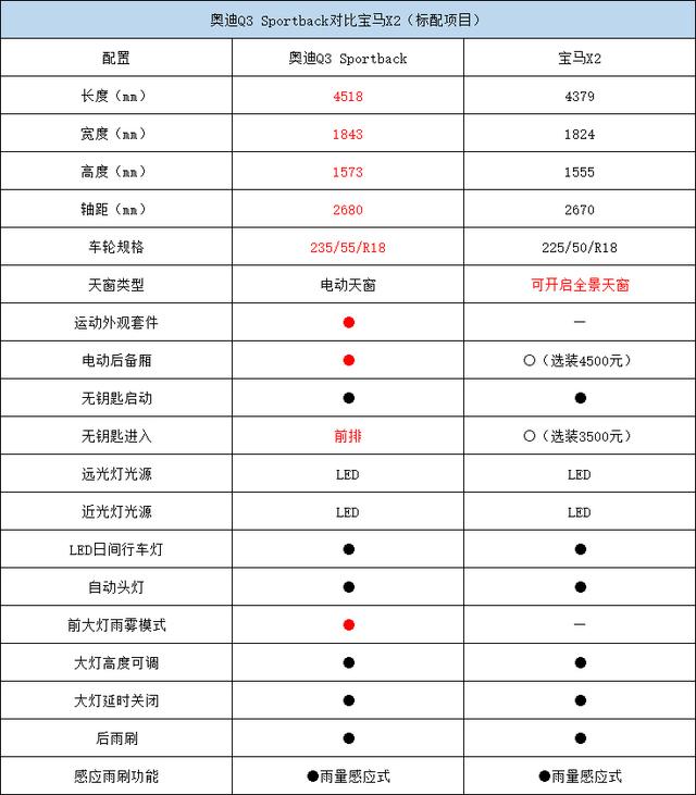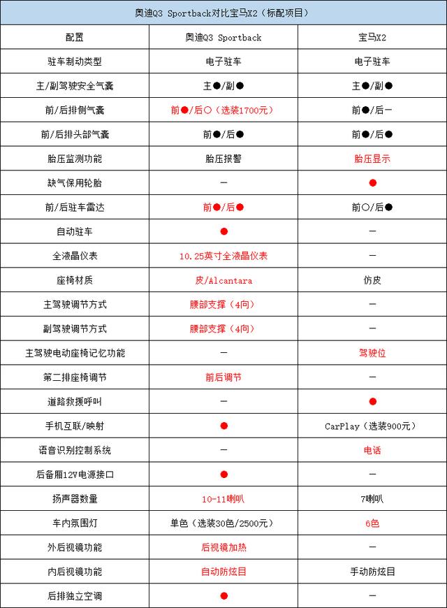 奥迪Q3 Sportback以全新产品的身份进入市场,凭借自身实力在标准配置方面体现出近乎绝对性的优势,但对追求运动个性的消费者来说,宝马的驾驶体验还是非常诱人的。当然,我们本次对比仅限标准配置车型。