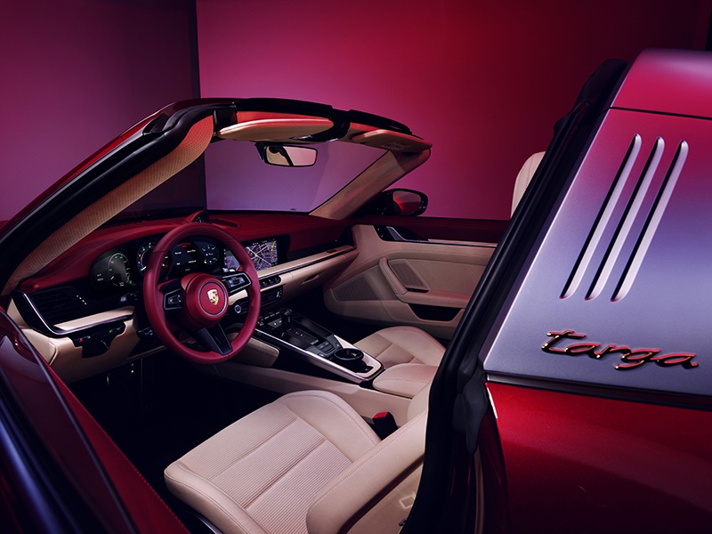 内饰方面,新车有两款独特的双色调真皮内饰可供选择:波尔多红色真皮搭配阿塔卡米色致新真皮,以及黑色真皮搭配阿塔卡米色致新真皮。座椅和车门饰件选用的灯芯绒。在座椅头枕上压印有保时捷盾徽。新车配备了采用最新技术的底盘、辅助系统和车载信息娱乐系统。