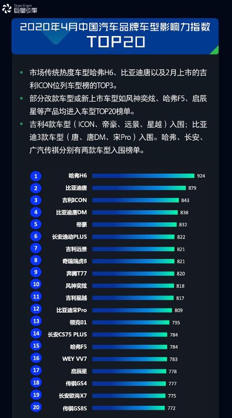 在中国汽车品牌车型影响力指数TOP 20榜单中,市场传统热度车型哈弗H6、比亚迪唐以及2月上市的吉利ICON (配置|询价)位列车型榜的TOP3。部分改款车型或新上市车型如风神奕炫、哈弗F5、启辰星等产品均进入车型TOP20榜单。吉利旗下ICON、帝豪、远景、星越4款车型入围;比亚迪旗下唐、唐DM、宋Pro入围;哈弗、长安、广汽传祺分别有两款车型入围榜单。