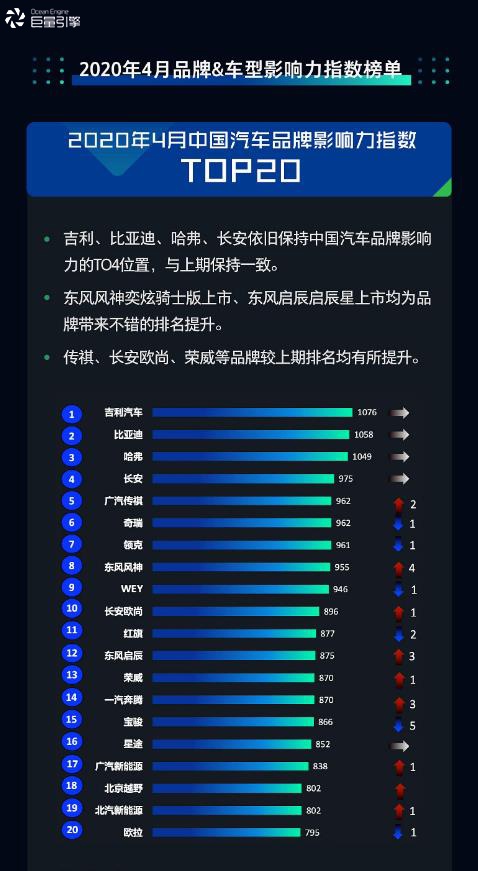2020年4月中国汽车品牌知识社区舆情月报出炉,本期中国汽车品牌影响力指数TOP 20中,吉利、比亚迪、哈弗、长安依旧保持了中国汽车品牌影响力的TOP 4位置,与上期保持一致。东风风神奕炫骑士版上市、东风启辰启辰星 (配置|询价)上市均为品牌带来不错的排名提升;传祺、长安欧尚、荣威等品牌较上期排名均有所提升。