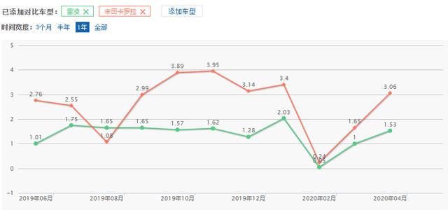 我们看看在广汽丰田雷凌 (配置|询价)和一汽丰田卡罗拉 (配置|询价)之间广大消费者朋友是怎么选的,上销量图。