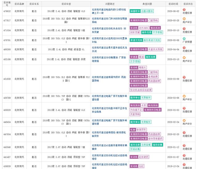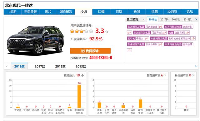 我们查看车质网发现胜达的用户满意度评分为3.3分,投诉主要发生在2013款车型身上,2013款车型投诉达到192个。
