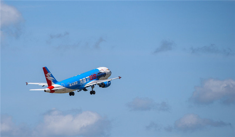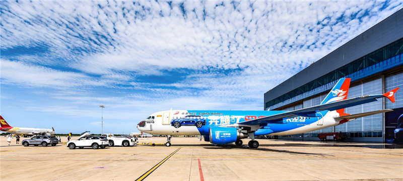 涂装T99形象的首航飞机,随着机库门的打开,在3台奔腾T99运动版车型的伴随下隆重出场。