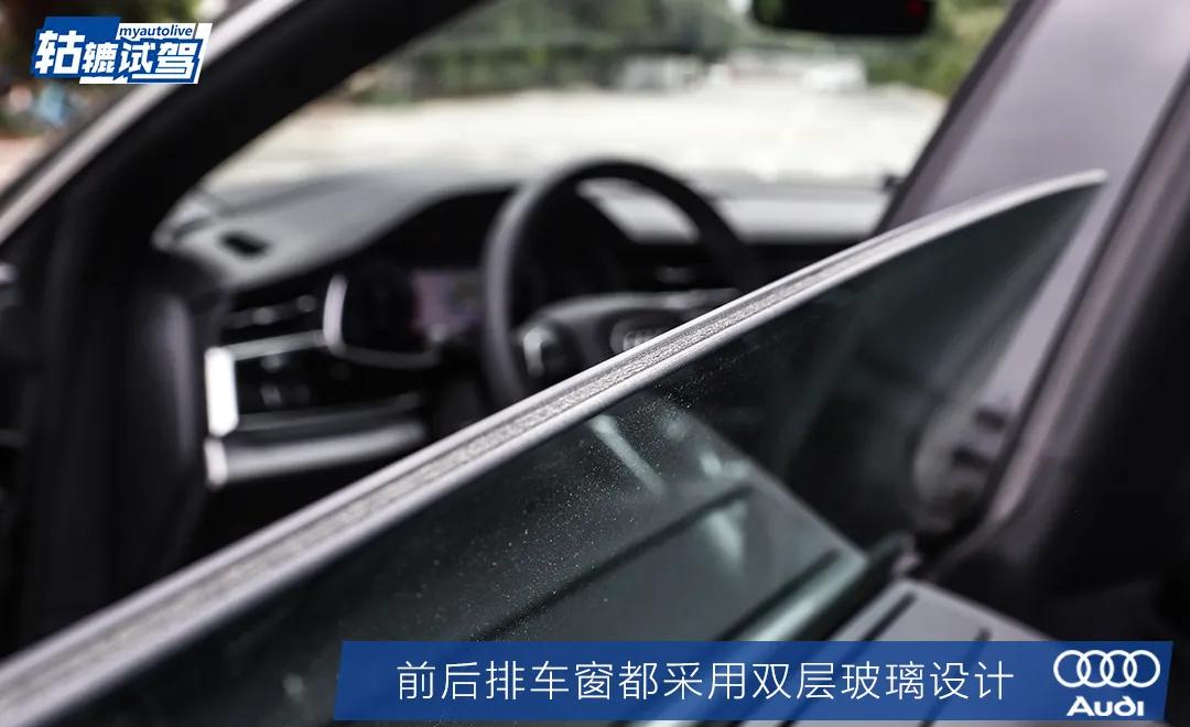 奥迪Q8优秀的隔音要归功于丰富的用料,尤其是车窗处,为了达到更好的隔音效果,奥迪Q8的前后排车窗采用了双层玻璃设计,并且轱辘哥认为试驾车的A柱用料也很丰富。众所周知,因为中大型SUV的车身较大,高速行驶时A柱往往有较大的风噪声,然而这种现象在奥迪Q8身上并不存在,即便车速不断升高,车厢内部的噪音并没有明显增大。不过这也带来一个问题,就是会让驾驶员误以为车辆的速度不够高,容易超速。
