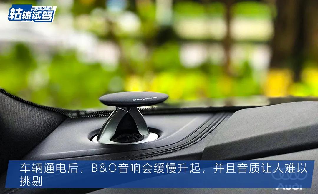 更有看点的是试驾车配备的B&O音响。当车辆通电后,B&O音响会在中控台上方自动升起,仅是仪式感,就能给很高的分数。更重要的是,这套B&O还能给人悦耳的音乐享受。用轱辘哥同事(音乐发烧友)的话来形容就是,高音清晰明亮,中频圆润饱满,低音浑厚有力而不浑浊。虽然对音乐不敏感的轱辘哥对同事的这句话没有太大的感觉,但至少能听出来这套B&O音响播放出来的音质更清纯。