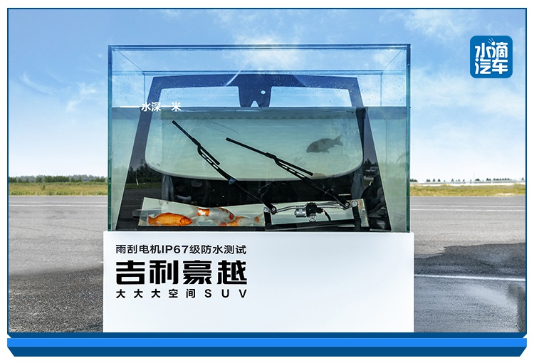 对于多数车主而言,雨刮电机是否防水是近些年才引起重视的细节。尤其在暴雨频现的地区,对车辆造成了很大的冲击。吉利豪越为证明其雨刮电机可以满足IP67防水等级,将雨刮电机置于1米深的鱼缸中浸泡30分钟,并保持工作状态,电机未发生进水、漏电等意外状况。此外,豪越还针对发动机进气口、变速箱通气口等关键部位进行了防水冲击的性能强化。