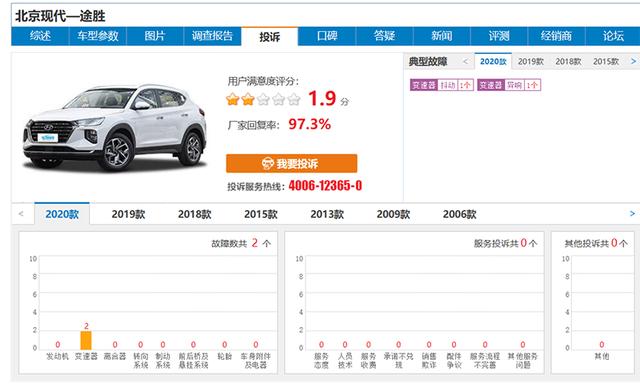 我们查看车质网发现北京现代途胜 (配置|询价)用户满意度评分为1.9分。可以看出,北京现代现在失去了不少消费者的信赖,消费者对其产品抱有非常深的意见。