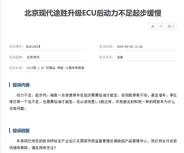 有车主投诉2018款1.6T双离合两驱15周年特别版北京现代途胜升级ECU后动力不足起步缓慢,投诉主要内容为:动力不足,起步肉。稍微一点坡度停车在起步需要给油才能走,否则就停那不动,甚至溜车,等红绿灯停一下也不走,也需要给油才能走。去4S店说是1.6就这样,可我朋友的和我一样的同款车为什么没有问题。