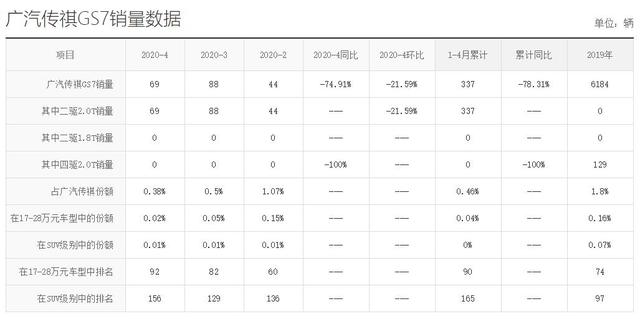 正是由于广汽传祺在GS8上看到了希望,所以这才顺势推出了GS7。作为一款大五座的SUV车型,传祺GS7有着和GS8差不多的外形体态以及尺寸,作为GS8的小弟,按理说价格更便宜的GS7应该是要能大卖才对,可惜事并不遂人愿,GS7自从上市以来其销量就一直不好。到了今年,这台车4月份仅仅卖出了69辆,1-4月累计销量也只有337台,如此惨淡销量也就间接证明该车型的正式失败了。可惜曾经广汽传祺厂家还对它寄予了厚望,如今看来也只不过是空欢喜一场了而已。