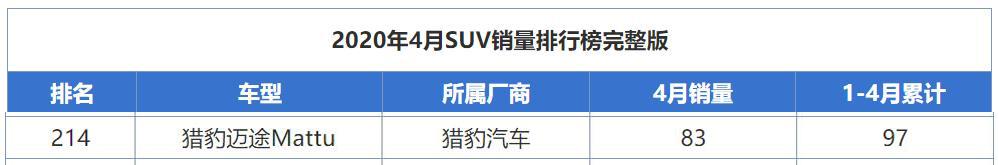 如今,猎豹迈途4月的销量仅为83辆,今年以来它也才卖了97辆,作为一款新车,取得这样的成绩真是惨不忍睹的。可惜的是,猎豹曾经还将它当做是振兴门楣的希望,如今却取得了这样的销量成绩,真是让人唏嘘不已。