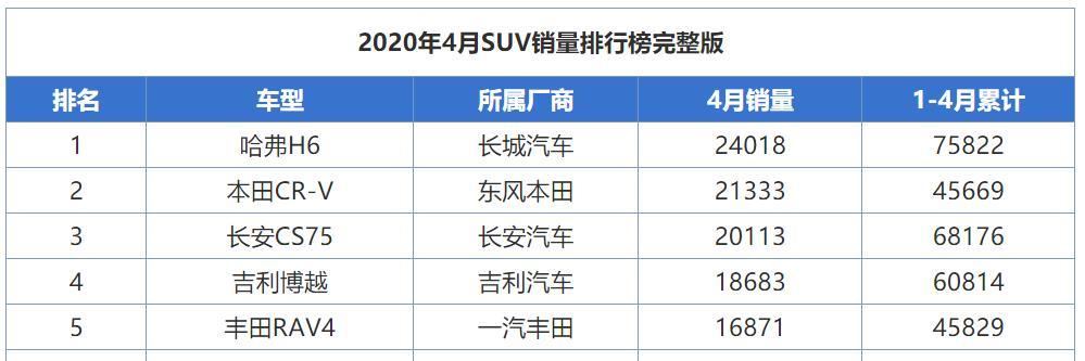 4月份SUV销量前五名