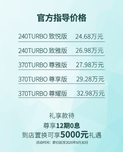 370TURBO车型所搭载的2.0T发动机,最大功率200kW, 峰值扭矩370N·m。整车的0-100km/h加速时长仅需8秒。而9AT变速箱的加入,不仅让动力响应更迅猛、加速更平顺,并且燃油经济性更高。