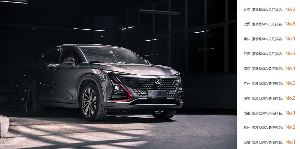 不仅于此,在汽车之家的车型详情页中可以看到,长安UNI-T几乎位列所有一线和新一线城市紧凑级SUV关注排行前三。