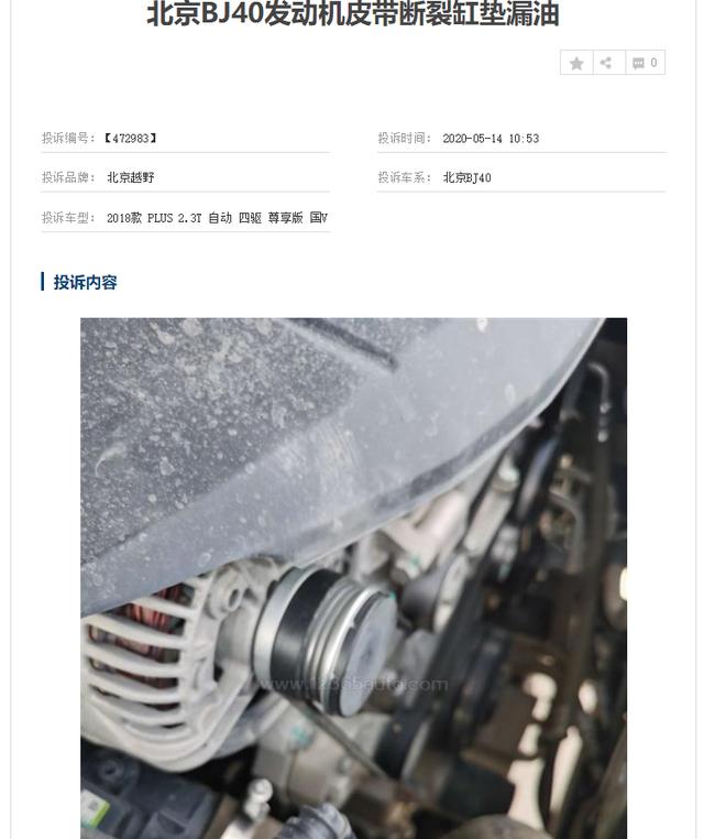首先,北京越野的主力品牌——BJ40 (配置|询价)遭到了众多投诉,其中,有用户投诉称,在购买该车两个月后发现了发动机漏油的现象,4S店回复说这个不是个别现象,经维修后其发动机漏油更为严重,在5月4日,发动机皮带断裂,而4S店表示,皮带不给予赔偿。两个月的新车发动机漏油,这一现象被4S店称为通病,实在是令人大跌眼镜。购买北京越野的汽车难道要刚买就要承担其发动机漏油的问题吗?新车发动机漏油属于汽车质量问题,而官方称其为通病,真是令人难以理解。