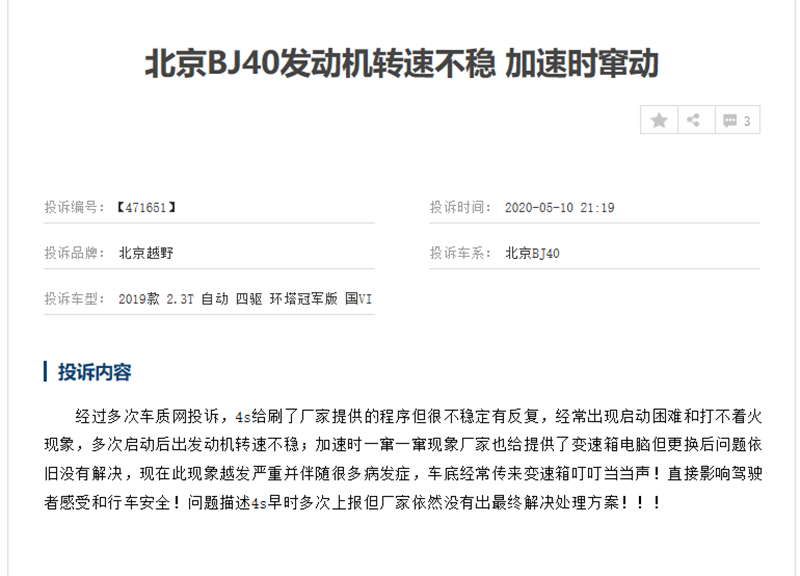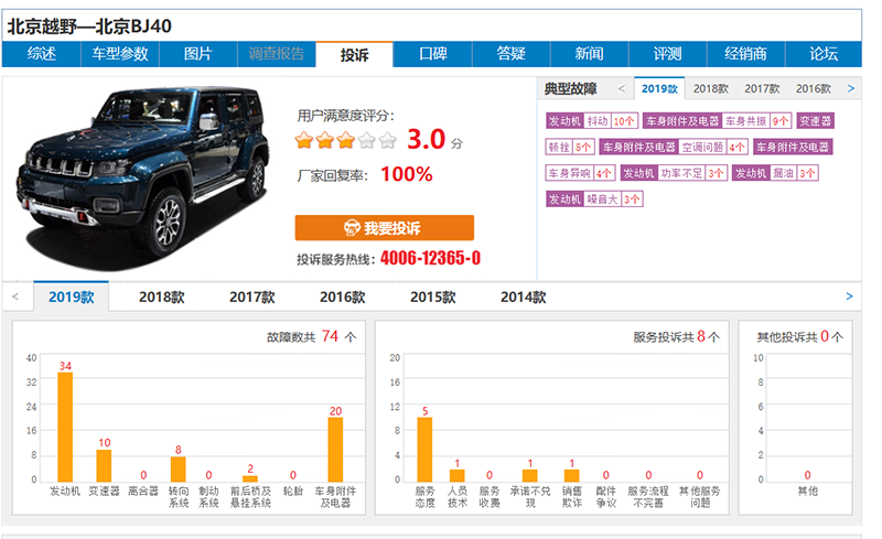 看了车质网关于BJ40的投诉后,我们可以发现这辆车并不像电影中表现的那样有着强大的越野性能,越野可以,但是越野过程中可能会随时出现问题。买一辆越野车本应该是和自由,享受,挑战,但是买了北京BJ40之后可能就要经常和和故障,维修,投诉等打交道了。