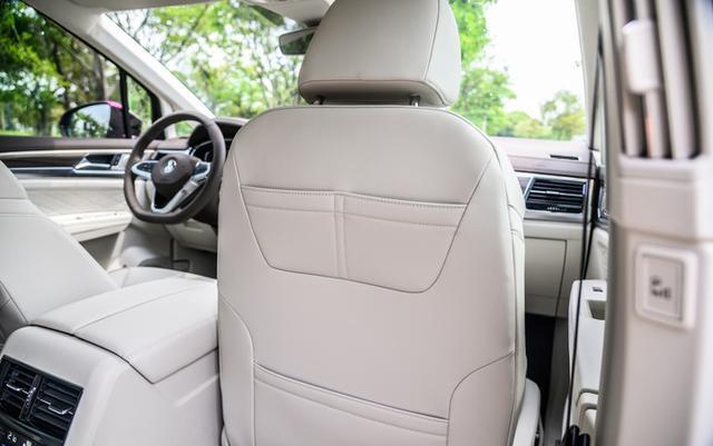但是,配置上也不是没有槽点,其中一个最明显的就是座椅通风了。不用怀疑,后排这张看起来牛逼实际也牛逼的座椅是有的,但是前排座椅是没有的,一开始我还怀疑是自己找不到开启的地方,但回去之后查了下配置表的确没有。而拍摄当天是雨天、晴天交替的天气,车外就是个蒸炉一样,所以当我进入到前排妄图开启座椅通风却找不到后心情那是非常的失落、无助,而且这项配置还真的是夏天神器,作为一个南方人,我真心希望大众能在改款的时候给加上。