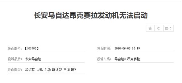 长安马自达昂克赛拉 (配置|询价)自推出以来,一直就是长安马自达主推的车型之一。凭借其时尚运动的外观设计,昂克赛拉受到了众多消费者的喜爱。但是在光鲜亮丽的外表下,昂克赛拉似乎也隐藏着一些问题。日前,我们在车质网了解到,长安马自达昂克赛拉遭到了消费者的投诉,投诉的问题为发动机无法启动。