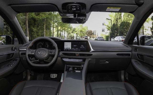 进入车内,索纳塔也开始走起了双屏设计路线,仪表盘和中控屏融为了一台,设计感确实挺强。不过中间的黑边挺明显的,如果做成全屏液晶显示的可能就更好了。整体来说造型很简约,运动氛围也不错。此外,材质和做工还是不错的,车内也使用了大量的软性材质进行包裹。换挡区域使用了按键式的电子换挡机构,与本田冠道 (配置|询价)2.0T上面的做法类似,看着也挺有科技感的。