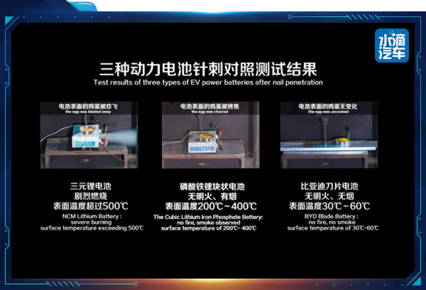 在实验中,同等的实验条件下,比亚迪的“刀片电池”在穿透后,无明火,无烟产生,电池表面的温度仅有30-60℃左右,甚至连摆放在电池表面的鸡蛋都无变化,仍处于可流动的液体状态。反观三元锂电池,在针刺瞬间,表面温度迅速超过500℃,并发生极端的热失控,爆炸并剧烈燃烧。而传统的磷酸铁锂电池虽无明火产生,但有烟,电池表面温度达200℃-400℃。