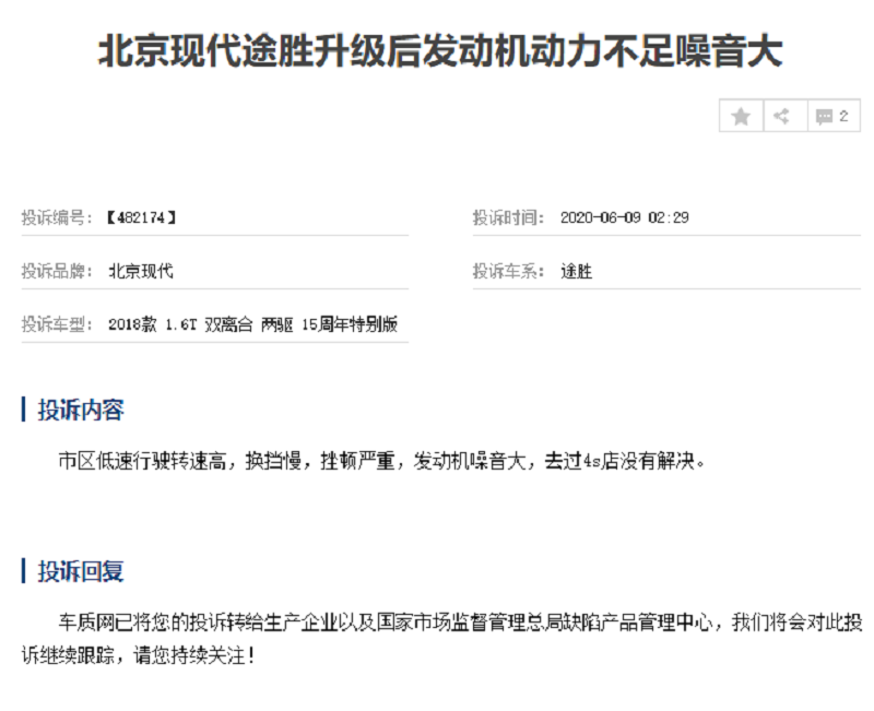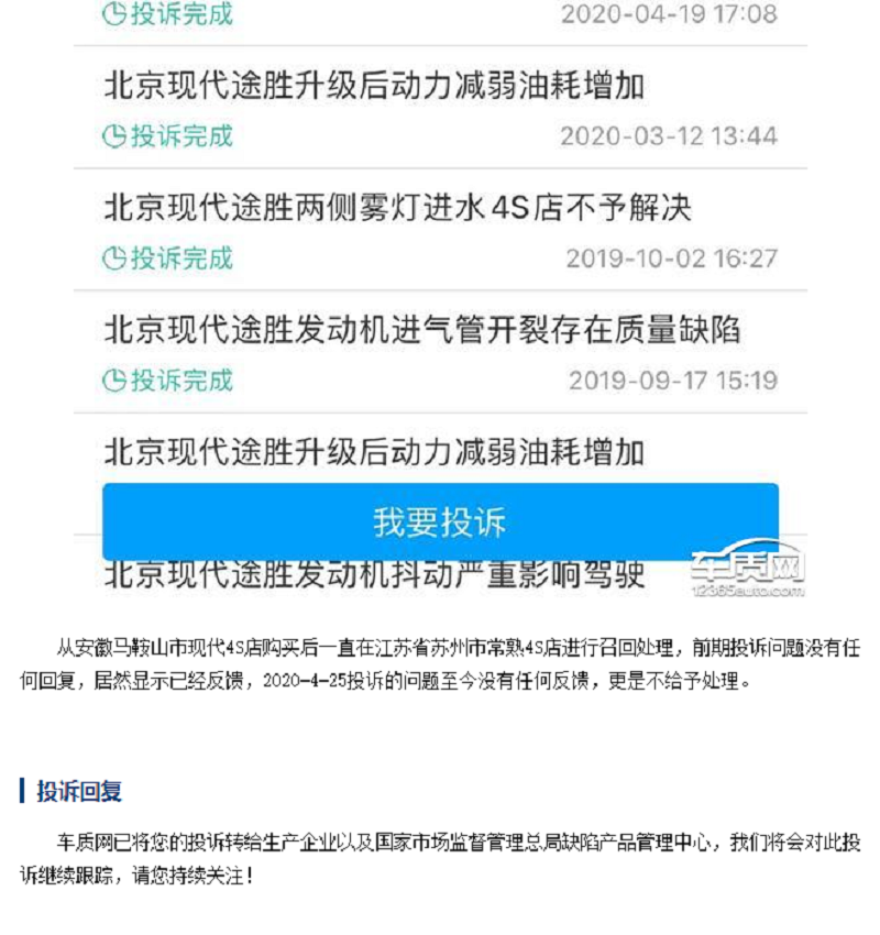 日前,我们从车质网获悉,北京现代途胜 (配置|询价)有多起投诉都是关于官方召回升级后动力总成却出现问题。