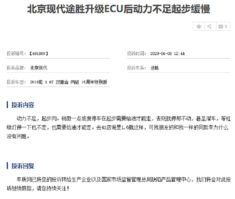 一位消费者投诉北京现代途胜升级ECU后动力不足起步缓慢,动力不足,起步肉。稍微一点坡度停车在起步需要给油才能走,否则就停那不动,甚至溜车,等红绿灯停一下也不走,也需要给油才能走。去4S店说是1.6就这样,可我朋友的和我一样的同款车为什么没有问题。