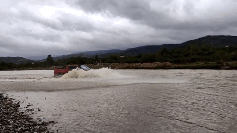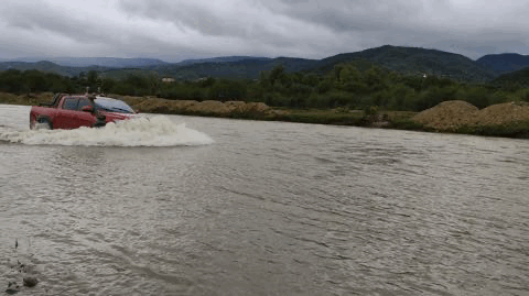 越野体验还有一段涉水路面拍摄,但由于存在一定危险性,厂家并未允许我们自己驾车到河中,而是由教练作为示范。可以看到由于标配了高位涉水喉,理论上涉水深度超过引擎盖也没问题,并且有了这样的装备,过河涉水也就不至于只用低速通过了。