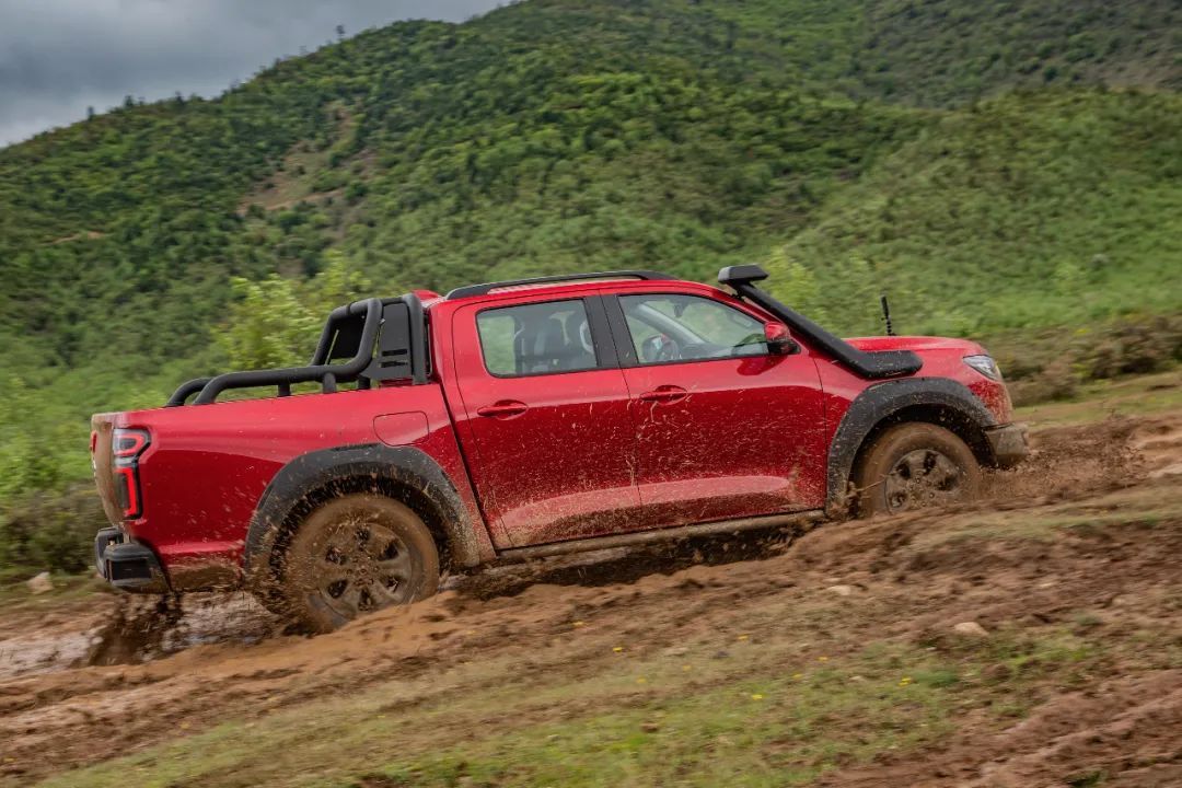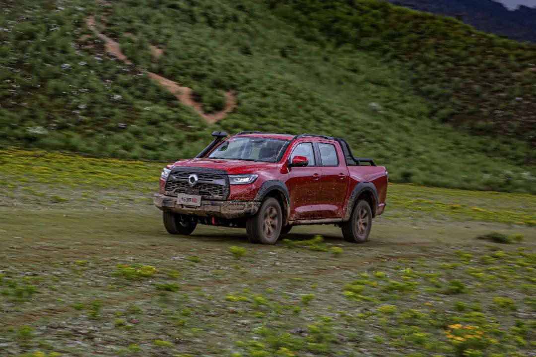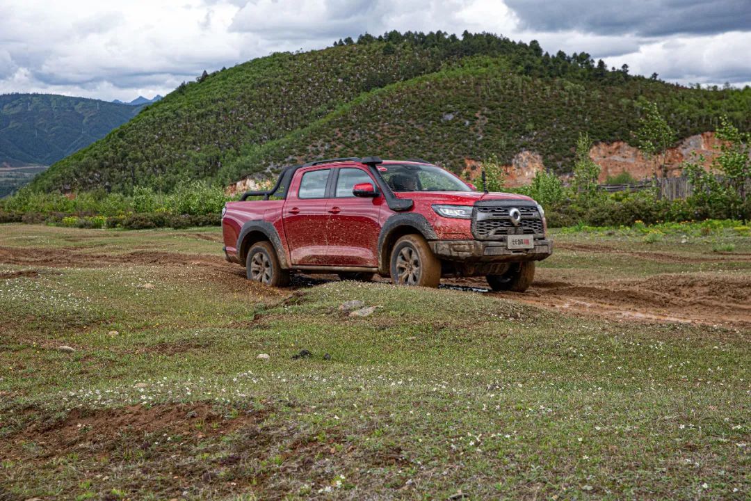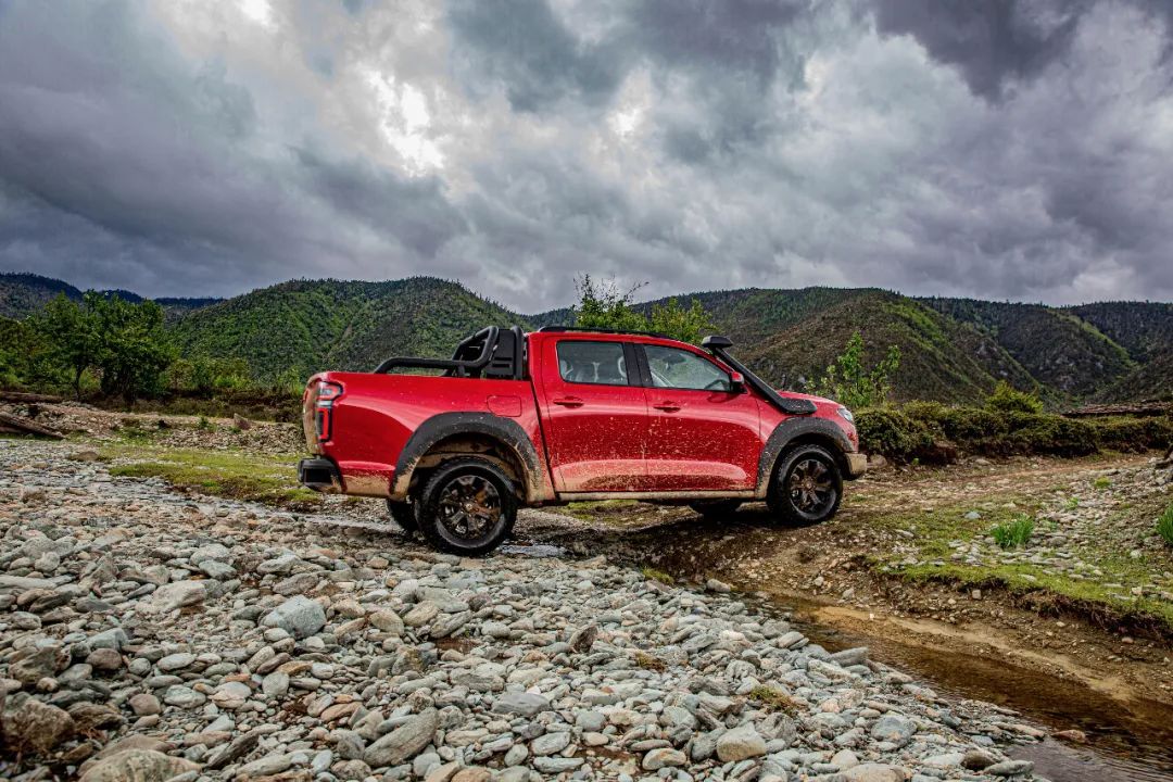而上下坡考验车辆的另外一点就是接近/离去角度,长城炮越野皮卡的接近角、离去角和最小离地间隙分别为30°、26°和228mm,和长城炮乘用皮卡比较接近。上下坡也轻松通过,前后包围均没有发生剐蹭;至于陡坡缓降功能我在这就不多加介绍了,这应该是这种类型的车辆常见功能。